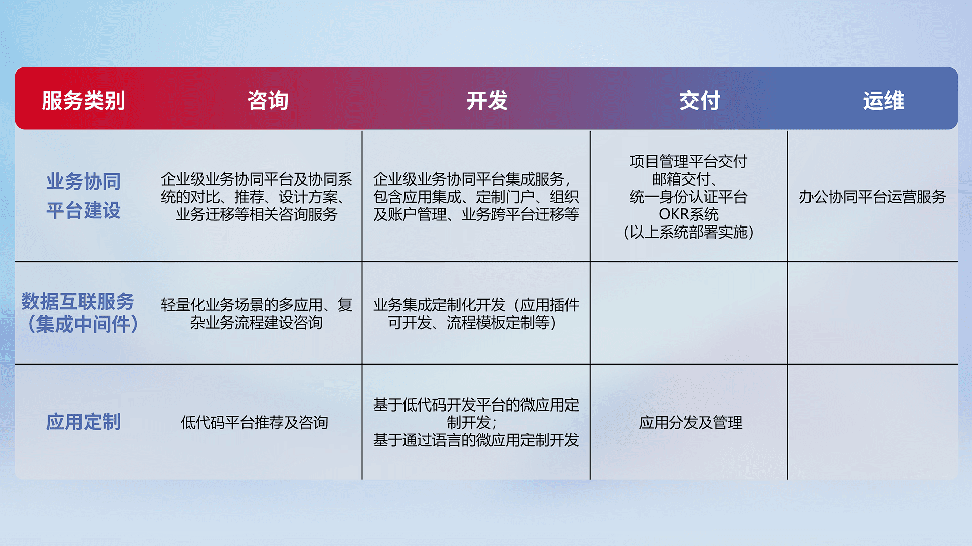 针对钉钉、、企微、、、IDaas等平台级产品提供产品的规划、、、、方案、、、交付、、、定制化开发等服务,,,实现如统一协同办公、、、智能客户服务、、混合会议管理、、、、智能数据查询、、、等业务场景,,,,实现数字化转型。。