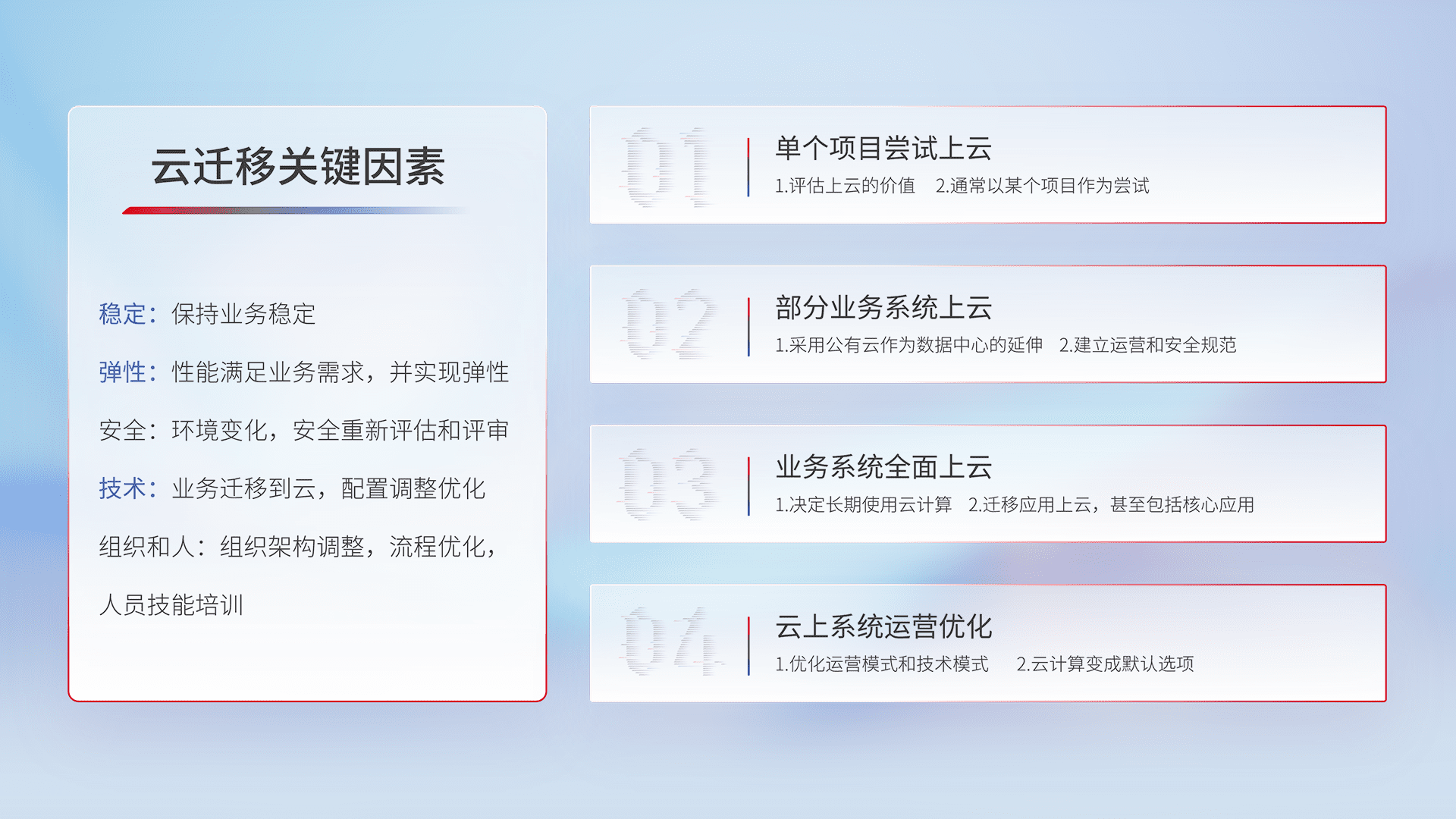 结合实际业务,,,,从规划设计、、、云平台选型、、、云原生改造、、数据迁移、、集成交付,,,迁移全过程为客户识别最佳上云路径,,,,做好风险识别管理,,设计网络架构、、身份权限、、安全审计合规、、、、操作审计、、、日志审计、、、监控告警策略、、、、多站点容灾设计等,,,对云上基础设施进行整体规划,,,提升IT治理水平,,,,以满足弹性、、、、高可用、、高性能的需求。。。。